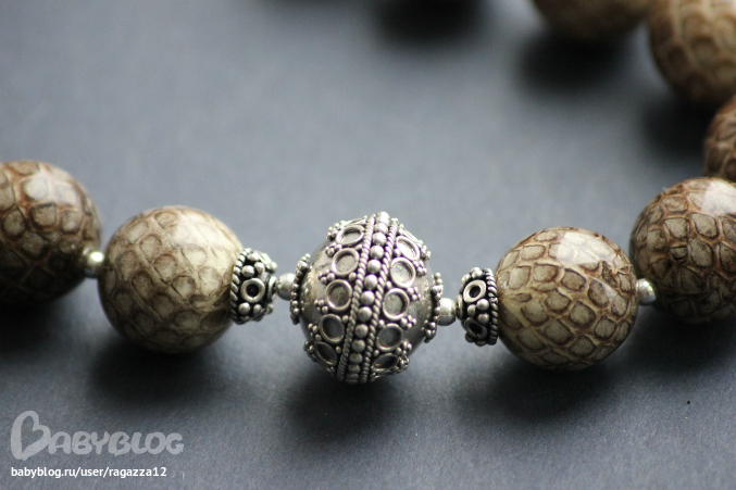 покажу еще "кусочек" одних бусиков ( они еще не до конза доделаны).Из моих любимых бусин из змеиной кожи и серебра Бали .В центре серебр. бусина ручной работы ,почти 2 см.
