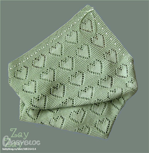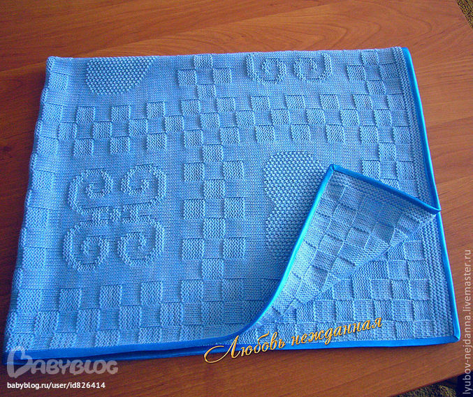 у меня та же проблема, у сотрудницы в начале марта внук родится. До этого вязала пледик без схемы, просто квадратами в шаахматном порядке: один "рисом", другой на фоне лицевой глади сердечки тоже "рисом", и "рисовая" кайма, а между каймой и основным полотном со всех четырех сторон через равные промежутки (см 5) делала дырочки (две лицевые вместе, накид) и потом в эти дырочки вдевала белую атласную ленточку. плед был тоже для мальчика поэтому еще на маленькой булавочке делала бантик с цветочком ( не все мамы мальчиков в восторге от цветочков).