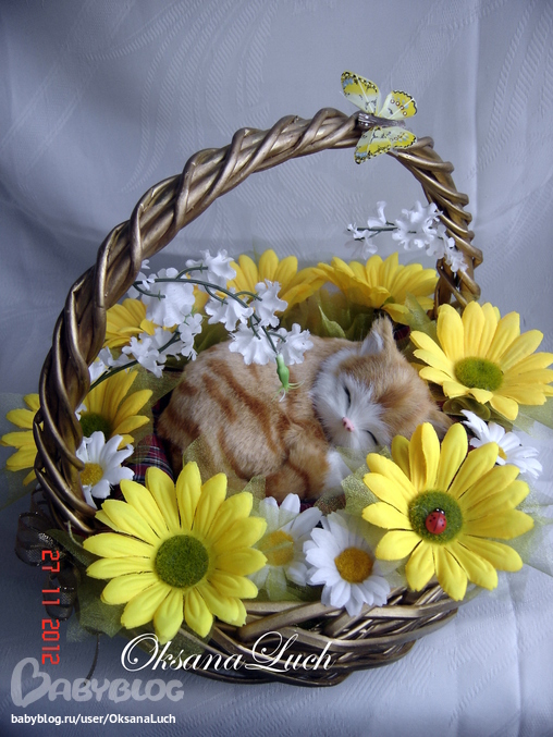 Прелесть какая, а с киской мне еще больше понравилась ( ну может даже по тому , что я по натуре кошатница), а может и из-за формы корзины и довольной мордашки котофейки. Ну все равно, ПРЕЛЕСТЬ!!!!