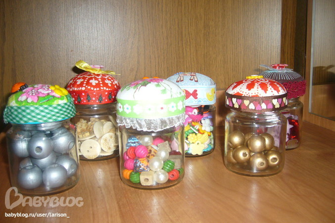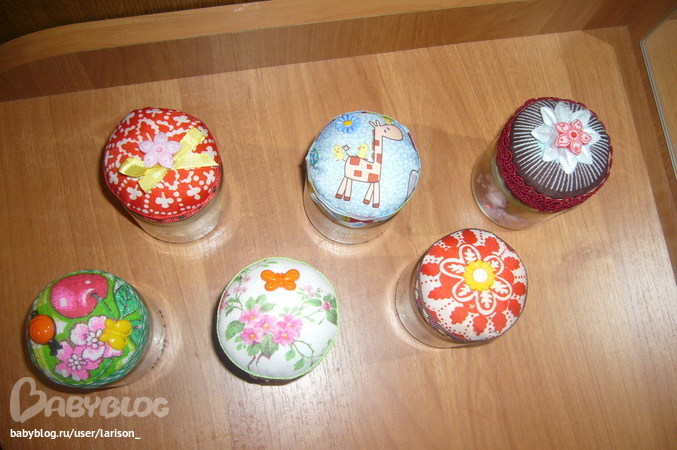 Шитье одежды, выкройки, ремонт одежды, шторы, швейные машины (уже приобретенные)Сегодня наваяла за 2 часа.Узнаете? Баночки из под детского питания. Крышечки оформила красивыми тряпочками,тесемочками и вот результат! Красиво,глаз радует.