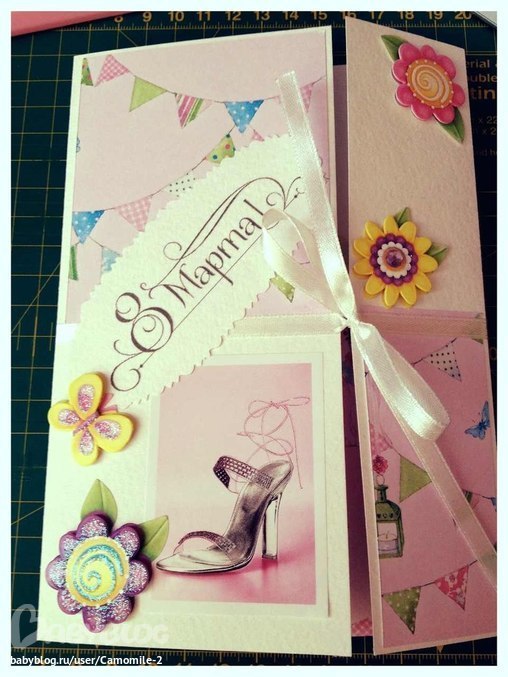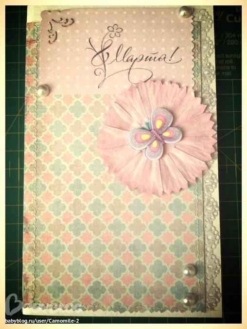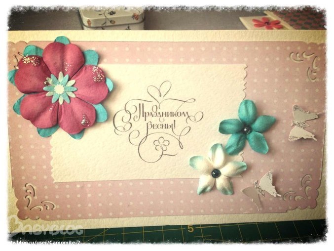 Заказал один мальчик, чтоб я сделала 3 открытки. Я их редко делаю, но отказать не могла, тем более никаких ограничений, только приурочить к 8 марта:) идеальный заказчик:)))