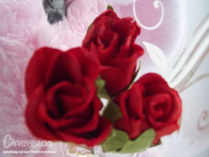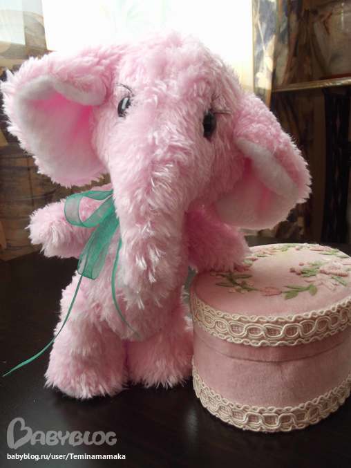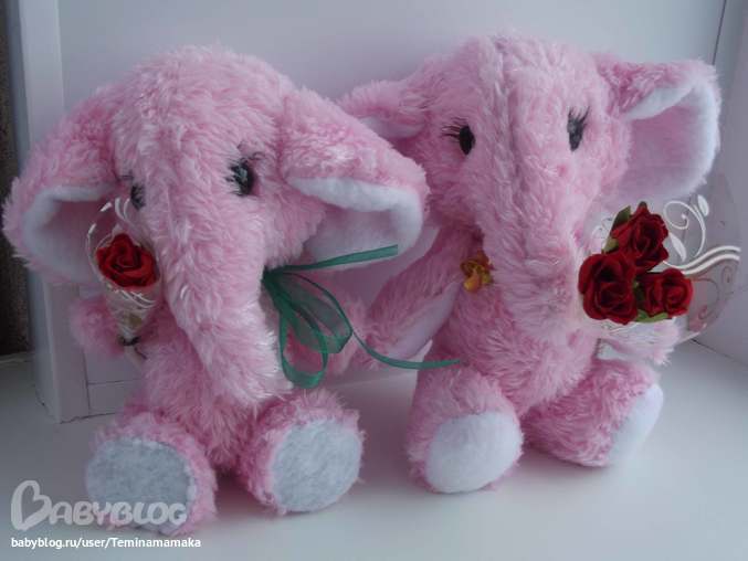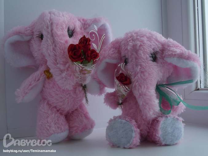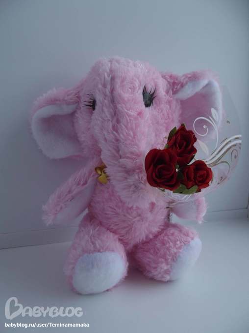 Попросили на 8 Марта сшить повторчик розового слона, которого я дарила дочке. Вот родился такой упитанный братик-близнец! На шее - колокольчик и в лапках букет алых роз!!!