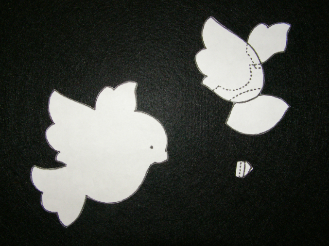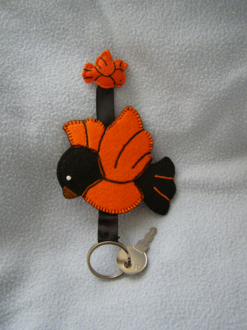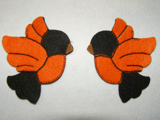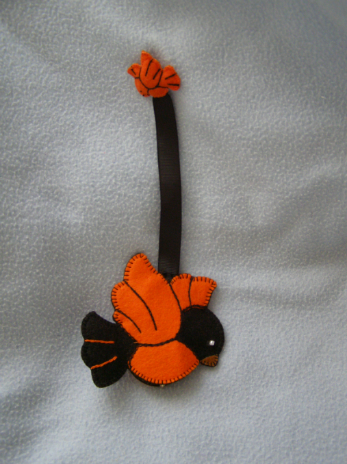 Сшилась на одном дыхании, времени заняло в общей сложности мало, только с моим хозяйством и не умение заняло два вечера. Птичка очень понравилась доче!! Фетр черный жесткий 1.2мм, оранжевый полушерстяной 1.2мм. Картинку взяла из апликации увеличила в ворде, распечатала и вырезала детали. Крылья и грудка вместе одной деталькой прошито черным мулине, глазик бисеринка, клювик приклеен и сшит по краю. Ленточка репсовая, она прочнее атласной. Вначале пришила крылья и грудку, а потом сшила две половинки.