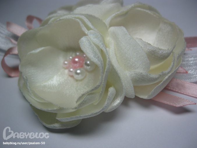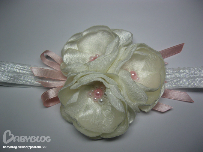 Свет, наверное вот такого плана нужна повязка, с такими ленточками ицветочками, только цвета золотая резиночка,кремовые цветочки,ну и ленточка если есть, как на нашем платье цветочки, или что-нить в тон подобрать )