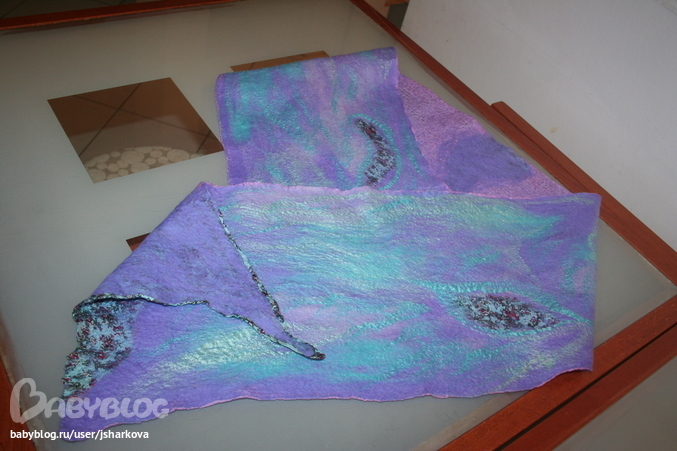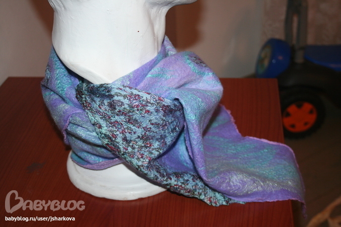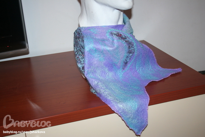 Использовала Австралийский меринос 18 мкрн (пр-во Италия), на шелке 100%, декор - шелк и вискоза. Эксперементировала с "аппликацией" -шелк с цветочками, для меня это пока очень трудаёмкое занятие, старалась сделать очень тонкую раскладку (с этим уже лучше), ВШМ прошлась один разок, больше старалась ручками работать, старалась увалять максимально (тут даже переусердствовала, в ширину сел почти в 2 раза), до момента ополаскивания ушло 8,5 часов (без сушек/глажек)...