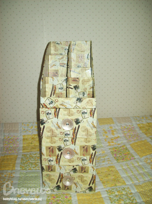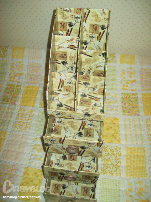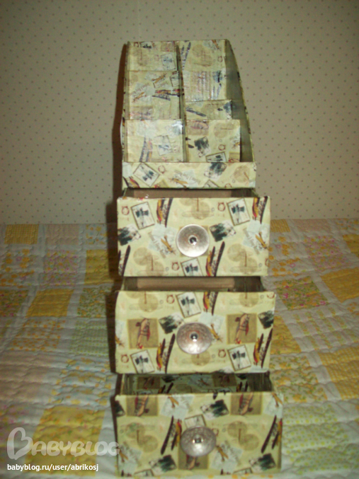 Татьяна в Рукоделие 13 лет Комодик из картонных коробок. Декор, витражи. Смастерился еще один...на этот раз на рабочий стол, чтоб убрать все лишние подставочки и т.д..... Посмотрите еще 20 записей на эту тему Отменить Ответить Любава какая прикольная, мне бы на рабочий стол такую))) 07.03.2013 Ответить Татьяна спасибо))) 07.03.2013 Ответить Барышева Елена Здорово! Спасибо за идею! 06.03.2013 Ответить Татьяна спасибо!!! пользуйтесь на здоровье)) 07.03.2013 Ответить Машенькина мамочка Классная штука! Для мелочевки самое - то! 01.03.2013 Ответить Татьяна спасибо))) 02.03.2013 Ответить ulia А мастерклассом не поделитесь ...такая штуковина очень пригодилась бы 01.03.2013 Ответить Татьяна блин...а я как-то без него мастерила....на глаз все))) 01.03.2013 Ответить ulia здорово 01.03.2013 Ответить Татьяна http://stranamasterov.ru/node/28831 для примера))) 01.03.2013 Ответить ulia спасибки 01.03.2013 Ответить Татьяна не за что...удачи в изготовлении)) 01.03.2013 Ответить ulia 01.03.2013 Ответить Татьяна Симпатичный получился, самое то для всех небольших сущностей 01.03.2013 Ответить Татьяна спасибо....в него столько всего влезло...ужас...у меня стол теперь пустой...все в нем))) 01.03.2013 Ответить Татьяна Возьму на заметку идею, мне вечно коробочек не хватает 01.03.2013 Ответить Корзинки из мыла Как можно сделать рамку? Чаты Беременных Выберите чат: Январята-2026 Февралята-2026 Мартята-2026 Апрелята-2026 Майчата-2026 Июнята-2026 Июлята-2026 Августята-2026