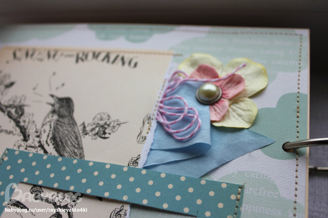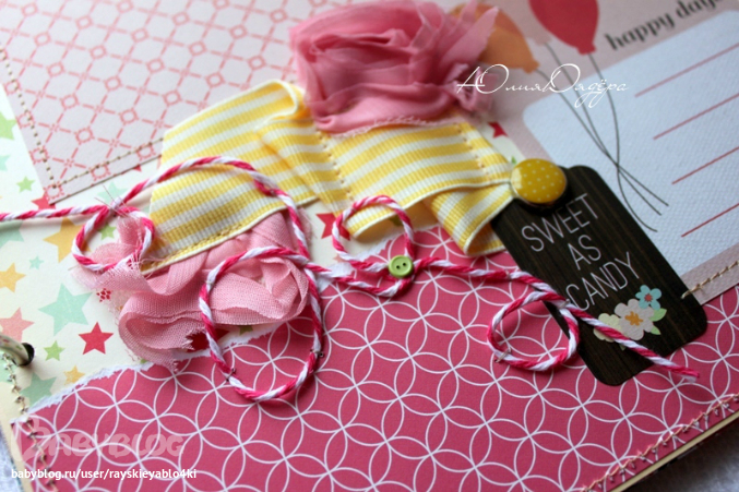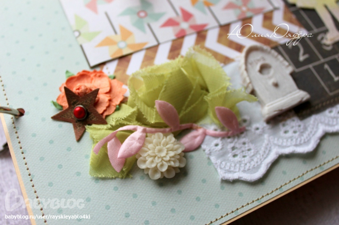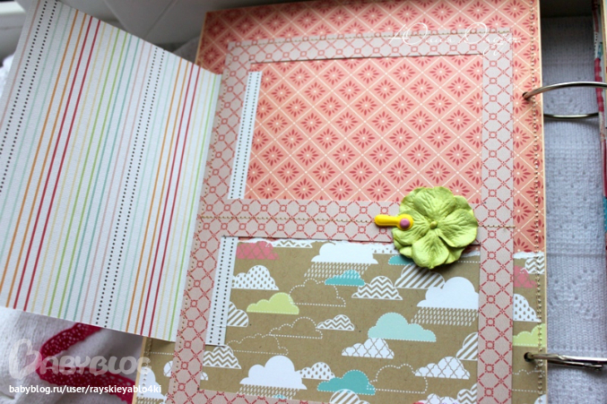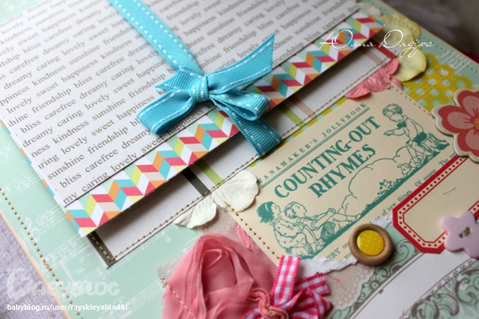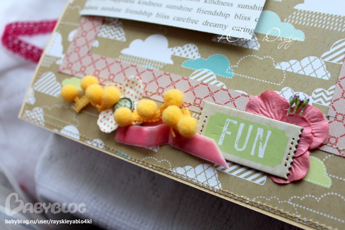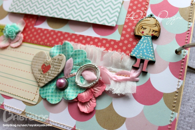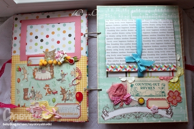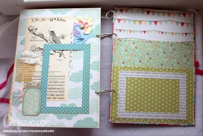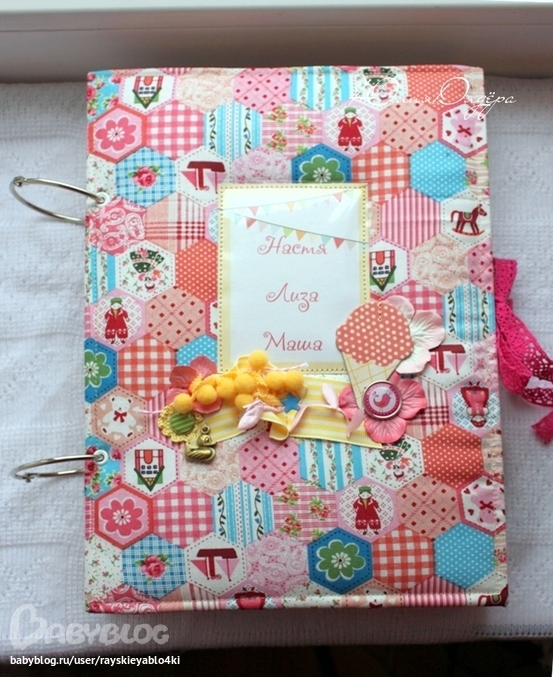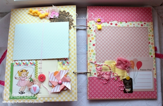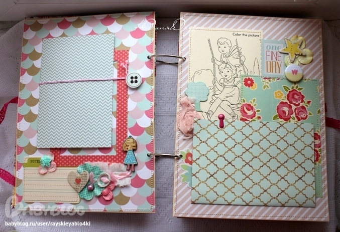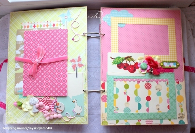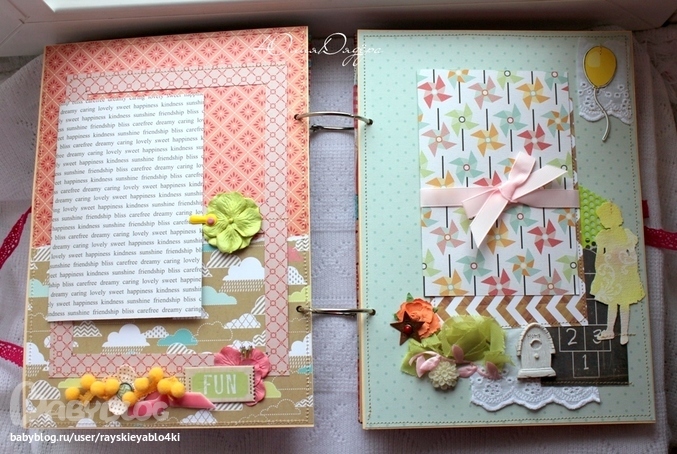 Скрапбукинги их чудесной мамы. Нежный, солнечный, веселый, как их фотографии (мама очень красиво фотографирует дочек, так что с наполнением альбом, думаю, заиграет на полную мощность).