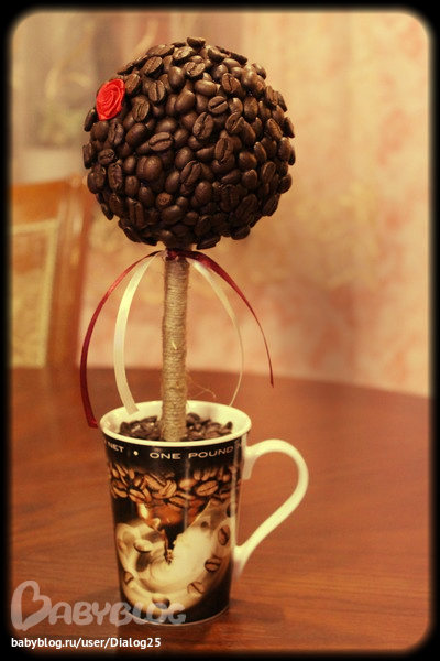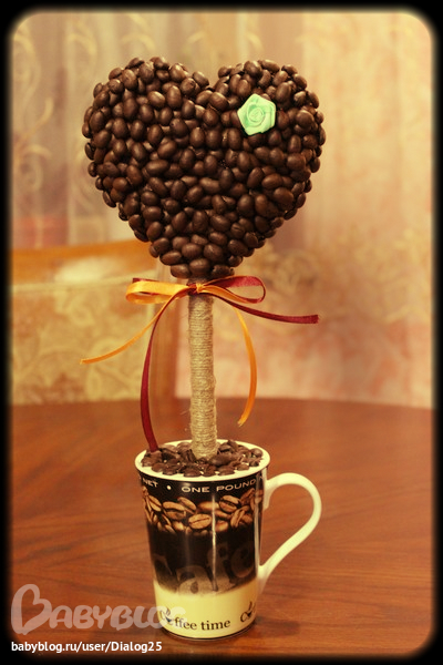 я делала так: вырезала из картона сердце нужного размера -2 шт, склеила между собой.. чтоб было чуток толще, можно кусочки картона сложить и склеить. и еще для объема приклеила ватные диски, посередине чуть больше, покрасила в коричневый цвет и оставила высыхать. А ну про палочку не забудьте. Ну а далее клеим коф зерна в 2 слоя.