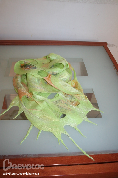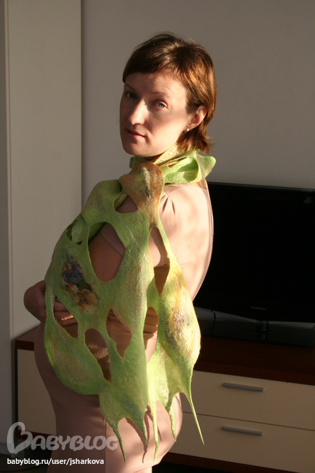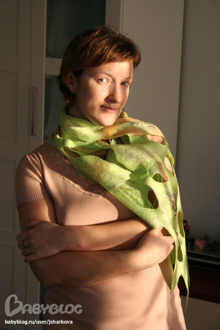 Фелтинг (валяние шерсти)По мотивам МК №4 http://www.babyblog.ru/user/jsharkova/3037935 сегодня наваляла шарфик... Техника простая и эффектная. Меринос 18 мкрн, 2 вида шелковых отрезов, 2 вида визкозы на декор. Время "приготовления" 4 часа (но у меня он не очень длинный). Важный вывод для себя - дырки будут больше чем на раскладке, декора нужно было положить побольше. Критика приветствуется! PS другой модели кроме меня не было, а жаль...