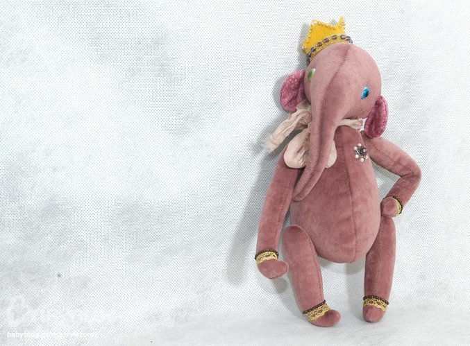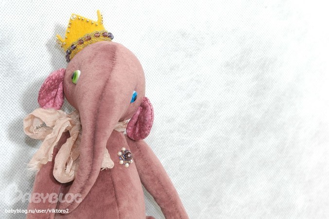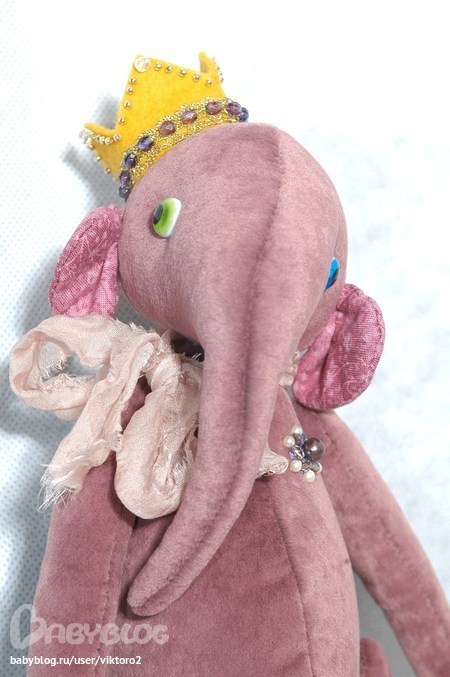 Слоник сшит из миништофа, ушки - американский хлопок. На головекорона из фетра украшенная блестящей тесьмой и расшита чешскими бусинами и японским бисером; шарфик - шёлк ручного окрашивания, 6 шплинтов (голова на двойном), глазки "Шерстяная лампочка", наполнитель холлофайбер и стеклянный гранулят. Животик набит не плотно.