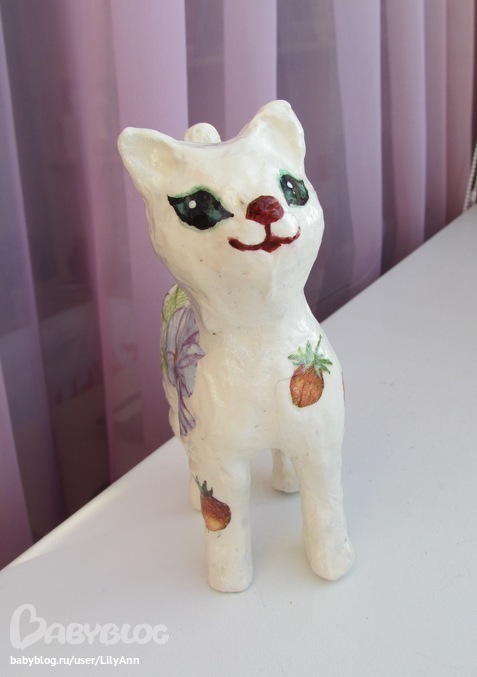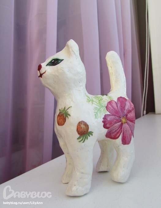 ДекупажВот такую кошечку я решила сделать в подарок лучшей подруге. Основа из папье-маше. Первая работа такого рода, поэтому не судите строго!)..Если сможете посоветовать еще варианты оформлений для следующих поделок, буду очень рада!:)