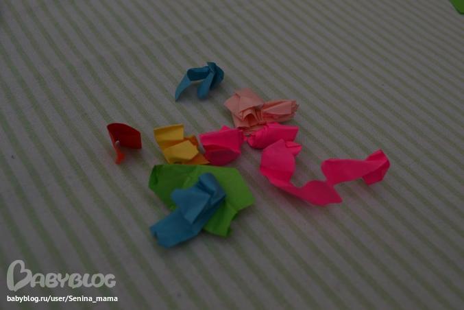 Учила ее скручивать бумажные полосочки. Нелегкое задание. В основном получались вот такие "завитушки"