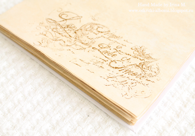 Формат-А5. 40 листов (80 страниц). Листочки блокнота тонированы в кофе с ванилькой и каждый листочек проштампован. Название самого блокнота переводится, как : "Любовь моя".