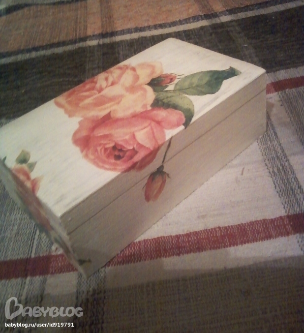 Изначально была шкатулка древняя лаковая с соломкой, все убрала, ошкурила и задекупажила. Это было 3 года назад.