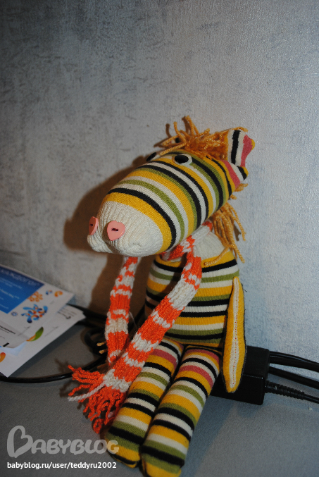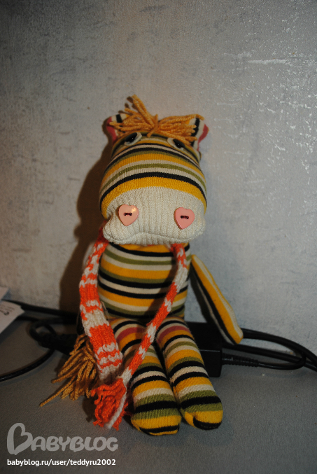 Игрушечный мир - животныеВсегда очень жаль выбрасывать такие яркие полосатые гольфы и носки. В принципе эту зебру оказалось делать не сложно. Набиваешь прямоугольнички чем-нибудь мягким и пришиваешь друг к другу. Гриву посложней приделывать конечно.