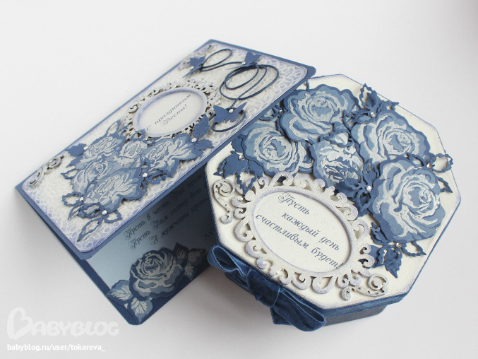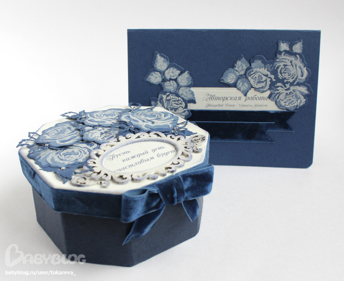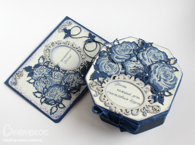 В синем комплекте, использовала штампы розы + эмбоссинг.