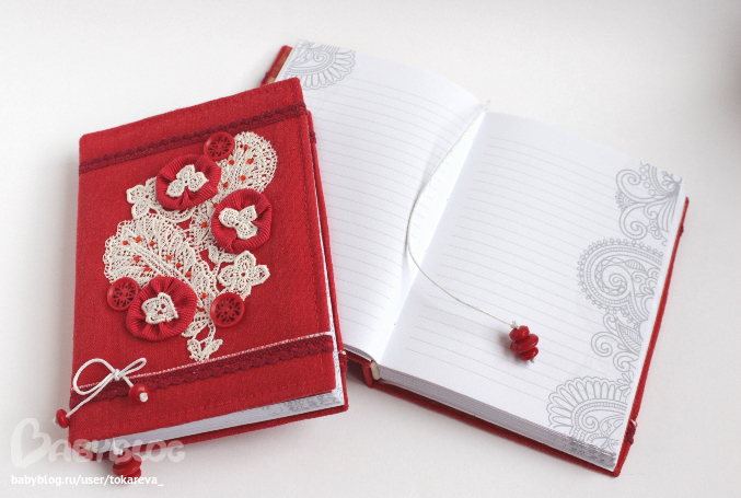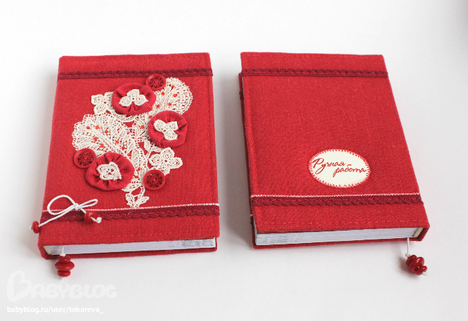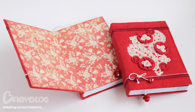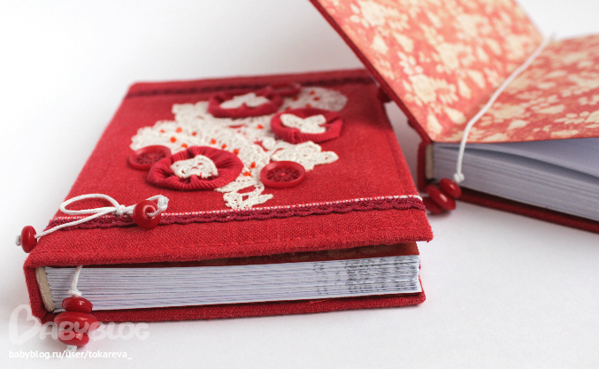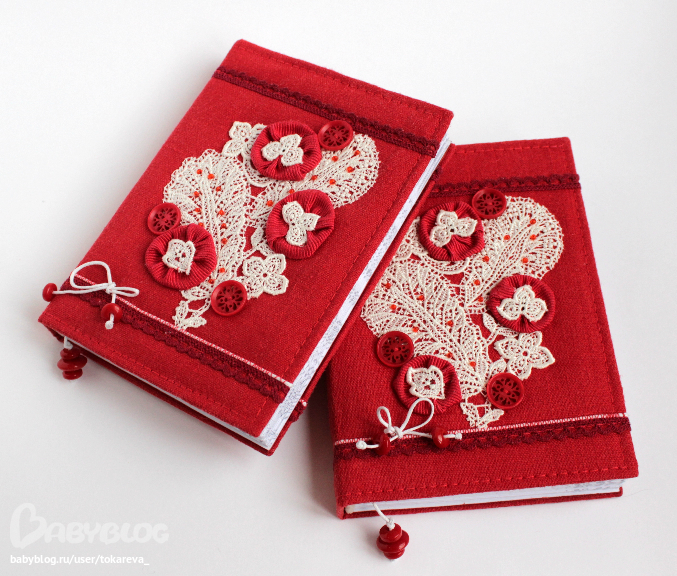 Блокноты с нуля, коптский переплет, мягкая обложка - красный лен, французское шелковое кружево, А6.