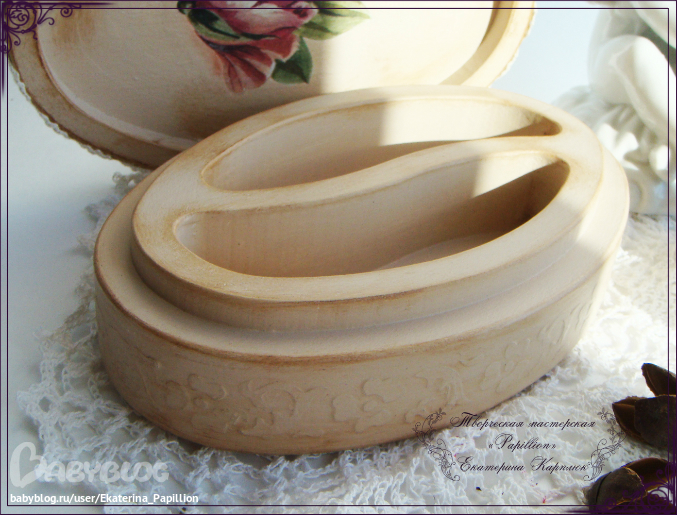 По технике и материалам: шкатулка из бука, грунт, мотив из рисовой карты, акриловая краска, рисунок через трафарет текстурной пастой Сонет, медиум антик Плейд 811, лак Тиккурилла Кива п/мат, сатиновый лак Феррарио, кружево, бисер.