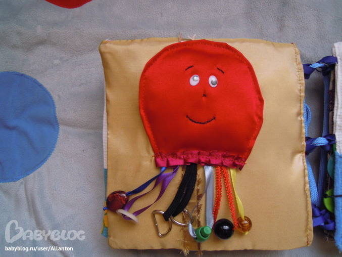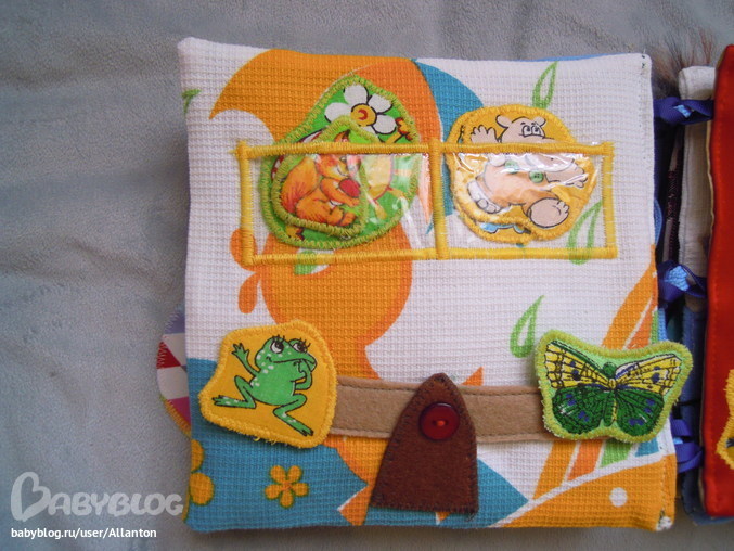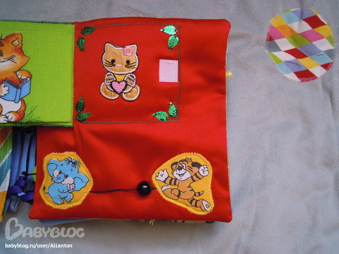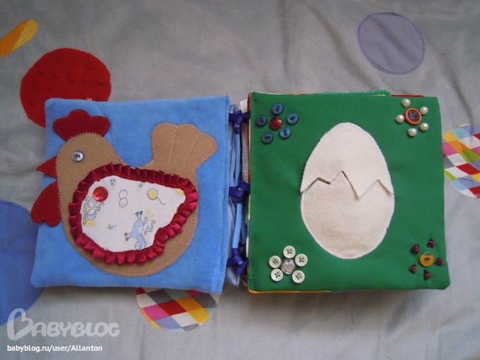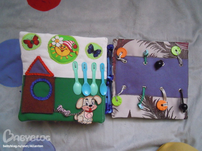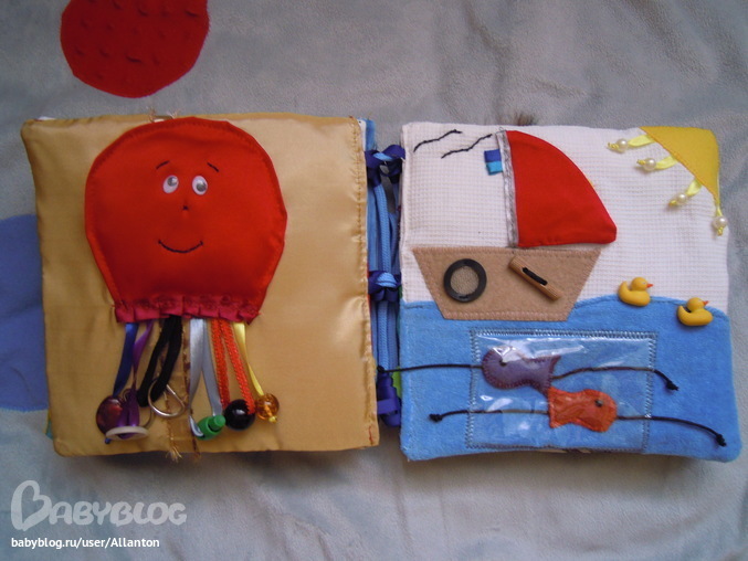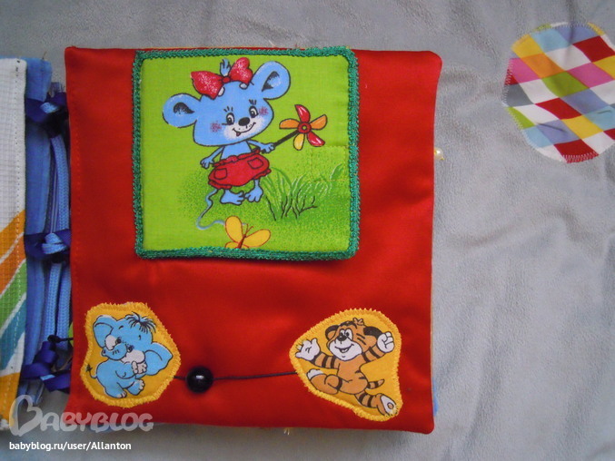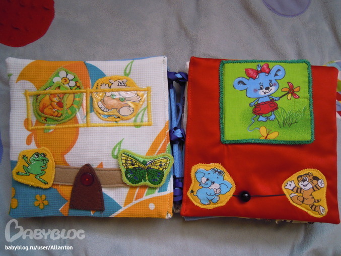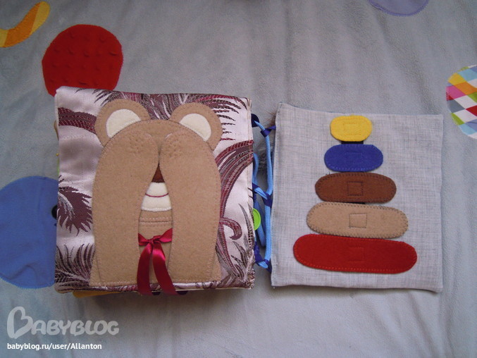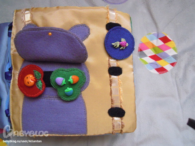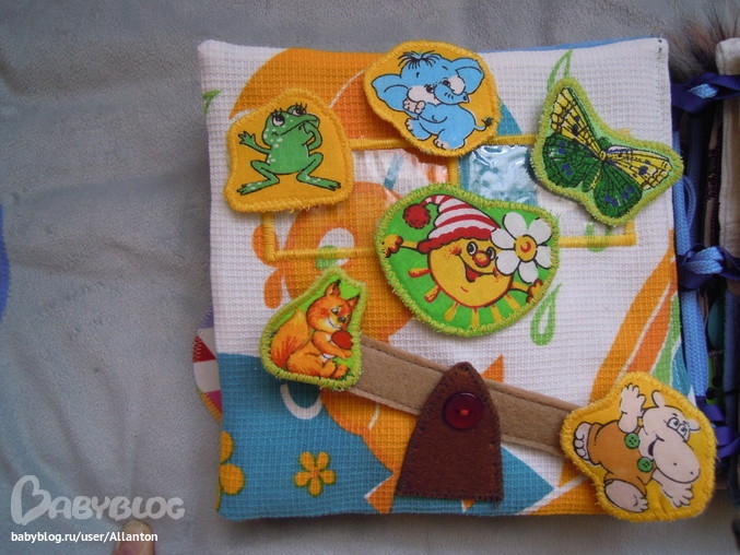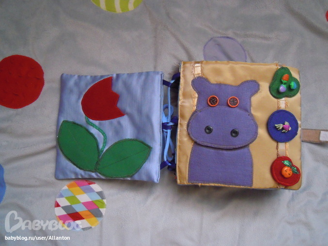 Сшила я 38 страниц развивающей книжки. Взяла лучшие, на мой взгляд, идеи у рукодельниц, за что всем большое спасибо. Материала получилось много, поэтому решила поделить на 3 книги по сложности: полегче, потруднее и еще потруднее, по возрастам. Это первая книга -- самая легкая.Размер 20 Х 20 см.