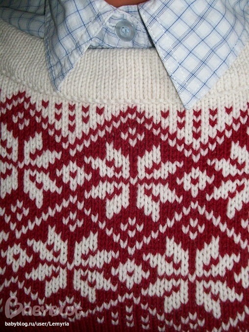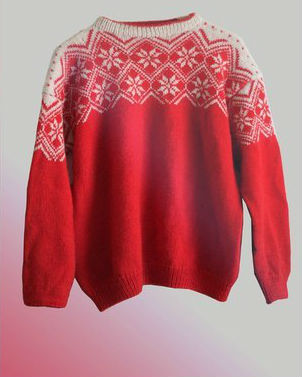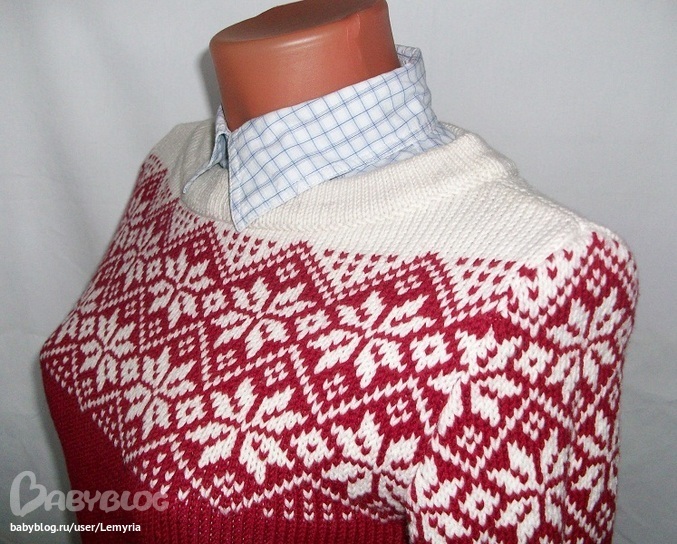 Классический узор – снежинки, мягко переходящий из красного в белый цвет, тёплый, уютный джемпер с приспущенной горловиной для повседневного ношения. Ворот красиво подчёркивает шею, можно также пододевать рубашку, водолазку.
