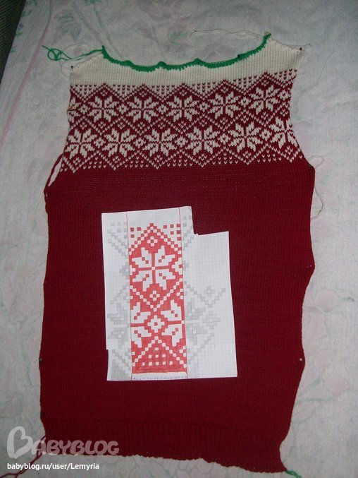 Выполнен на вязальной машине Нева-5, выкройку и рисунок рисовала самостоятельно, жаккард и резинки по низу изделия – ручная деккеровка, кеттлевка горловины на вязальной машине, сборка деталей на швейной машине, ВТО. Фото процесса, которые отправляла клиентке для согласования: