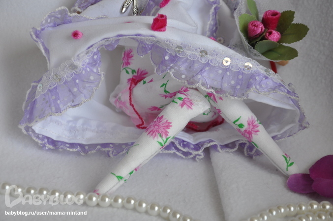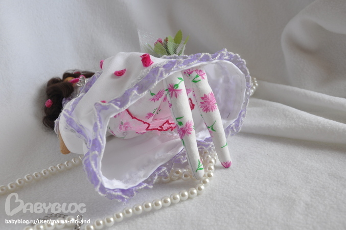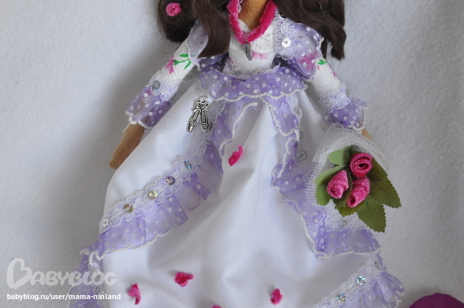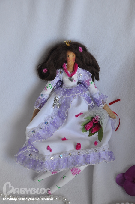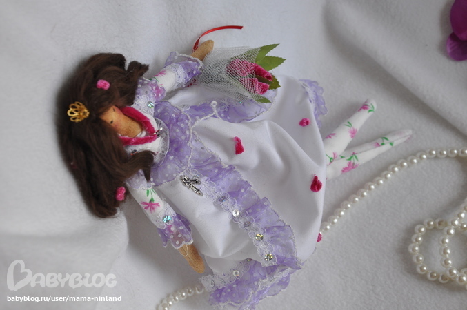 так получилось, что куколка родилась брюнеткой (цвет волос определяется в самом конце - после окраски тела, пошива наряда), а у меня темноволосых красавиц уже многоо, и я не знаю пока, куда эту определить (мои подруги, в основном - блондинки). так что если найдется ей хозяйка, буду оч рада! если ничего не придумаю, потом выложу её отдельно на рукодельный обмен.