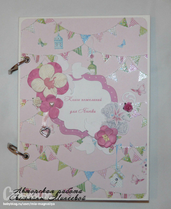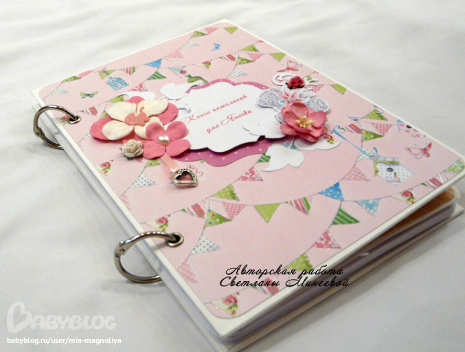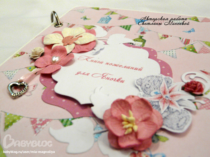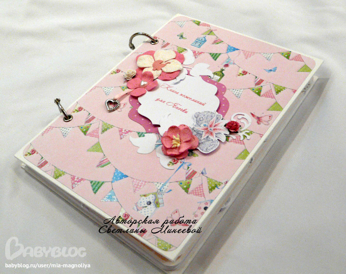 Книга пожеланий для девочки в тематике мишек Тедди. Формат А5, на кольцах, бумажная обложка на жестком каркасе. Внутри 20 листов цветной печати на плотной бумаге для пожеланий, 6 мест для фото 10*15 с пописями