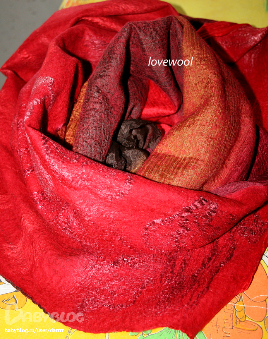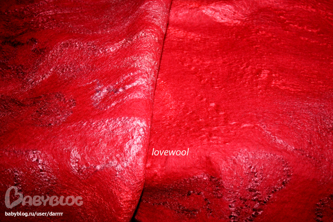но и чисто красный нам делать не хотелось... изобилие различный волокон для декора - лен, рамия, шелк, и шелковая вата... а шелковая сторона у нас тоже интересная... видите концы?? бордо, красный, слива, и старое золото)) все как в отттенках хорошего вина )