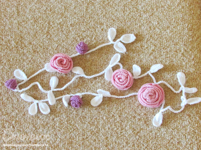 А розочки вяжу на глаз)))) Сначала веревочку из возд.петель, след.ряд - все столбики без накида, 3-й ряд - здесь уже начинаю делить на лепестки - вначале они покороче, а каждый следующий - длиннее. Лепестки вяжи примерно так: 1 СБН, 1 ПСН (полустолбик с накидом), несколько СБН, 1 ПСН, 1 СБН, и т.д. Надеюсь, понятно объяснила)))))