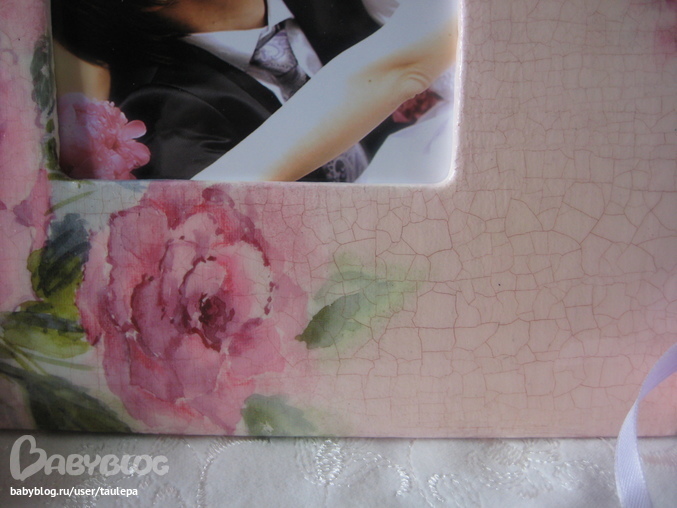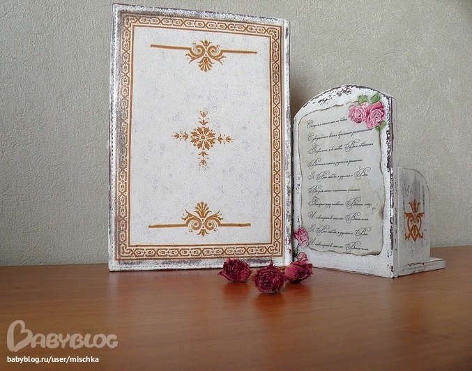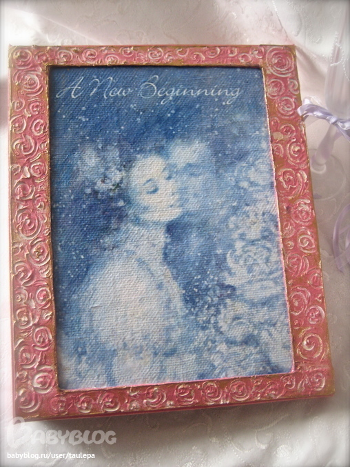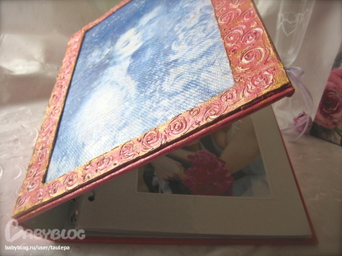 Зашкурила и загрунтовала альбом-папку, покрыла акриловой краской. Из картона смастерила рамку , загрунтова, нанесла текстурную пасту, сделала на ней подобие розочек. После высыхания губкой прокрасила розовой и золотой краской. Истончила с помощью скотча распечатку, после замачивания приклеила на ПВА на готовый загрунтованный холст (вбивая жесткой кистью). После высыхания разгладила холст с распечаткой под прессом, приклеила к альбому на ПВА, поверх наклеила рамку. Поркыла все несколькими слоями матового лака-аэрозоля.На заднюю поверхность альбома нанесла трафаретом рисунок, покрыла несколькими слоями лака+шкура, финальный слой - стекловидный лак.