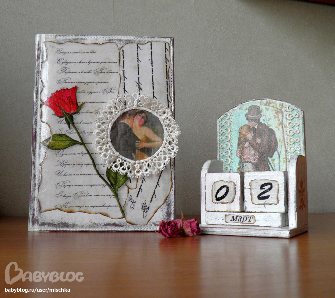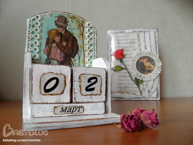 Вечный календарь - Загрунтовала заготовку. Покрасила коричневой краской, натерла воском места будущей затирки, покрасила белой краской, сделала потертости. На обратную сторону наклеила предварительно состаренную, истонченную и обожженую распечатку, покрыла лаком, пошкурила (несколько раз). Наклеила мотивы из салфетки, сделала тени, покрыла лаком, пошкурила (несколько раз). На лицевую сторону наклеила мотив из декупажной карты, покрыла лаком, приклеила кружева. Сделала распечатку цифр и названий месяцев, состарила с помощью кофе, обожгла, истончила и наклеила на кубики. Все покрыла лаком.