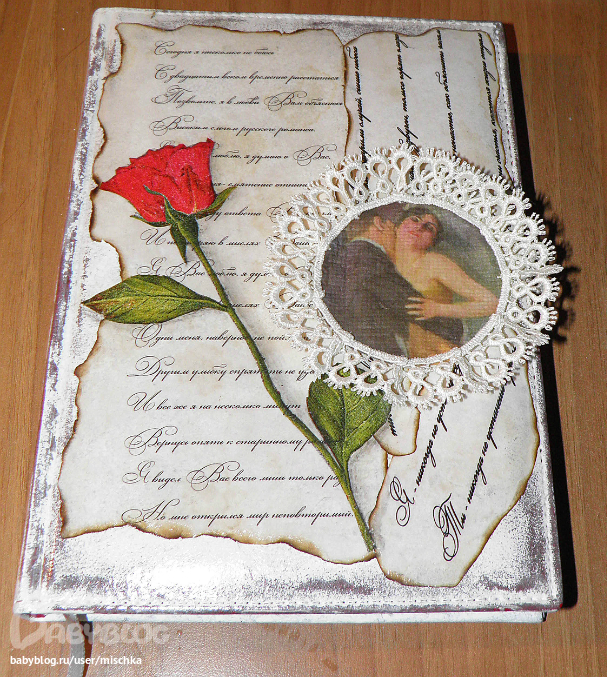 Ход работы: Дневник - обезжирила, загрунтовала, покрасила коричневой краской, натерла воском места затирки, покрасила белой краской, сделала потертости. На обратную сторону наклеила мотивы из салфетки и покрыла стекловидным лаком. На лицевую сторону наклеила предварительно состаренную, истонченную и обожженую распечатку, покрыла лаком. Наклеила мотив из салфетки, сделала тени, покрыла лаком. Сделала украшение: на мелкую канву наклеила мотив из декупажной ткани, пришила кружева. Наклеила его на обложку.