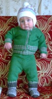 Когда я, еще только жила ожиданием встречи со своим младшим сыном, переживала как буду согревать его, когда он решит жить отдельно от меня и родится. Когда ушла в декрет, времени стало достаточно, чтобы как следует подготовится к нашей долгожданной встрече. И я решила связать ему костюм, хранящий тепло маминых рук. В рукоделие я не слишком большой профессионал, поэтому костюм связала очень простой, но , по моему получилось не плохо и даже довольно красиво, или это потому, что он на самого любимого человека надет? Наш костюм для малыша состоит из жакетика и штанишек.