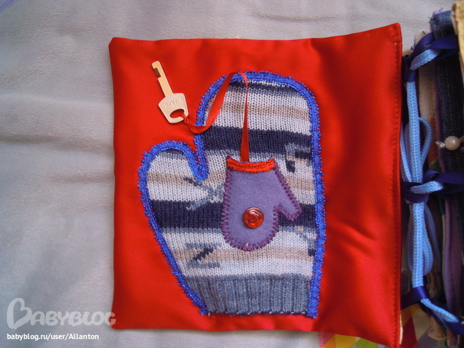 На большой варежке нашита маленькая варежка, в ней ключ, "открывать двери в доме"