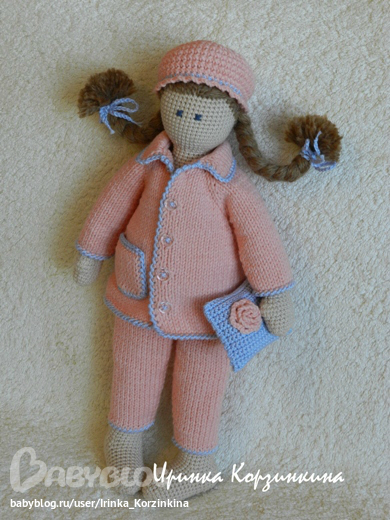 Все, как обычно. Кукла цельновязаная. Выполнена из хлопка с акрилом. Сидит, стоит с опорой. Наполнитель - синтепух. Волосы - верблюжья шерсть с акрилом. Пижамка связана спицами из хлопка с акрилом. Снимается частично. Вот такая она, сплюшка Сонечка.