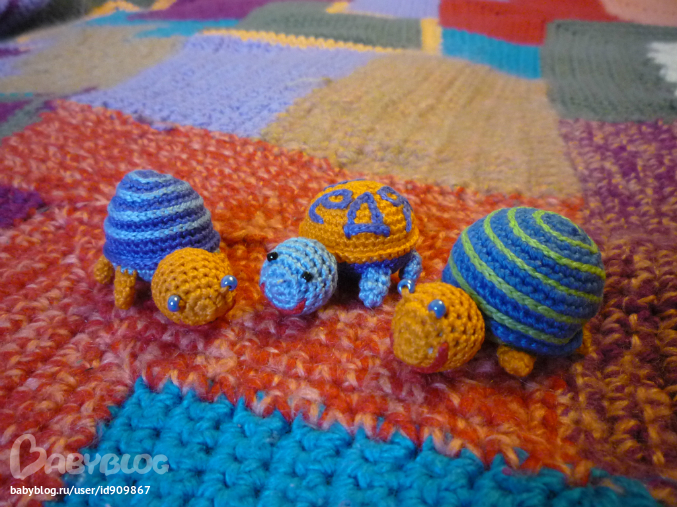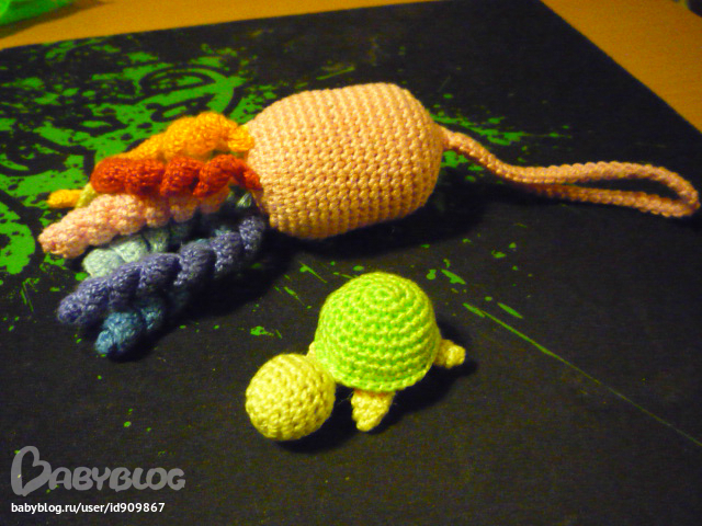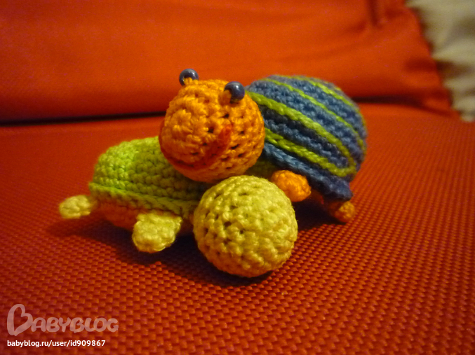 А это уже полосатая черепашка :) глазки -бисеринки, ввязанные, доче пока отгрызть не удалось:) хотя может потому,что я всегда рядом,когда она с мелочью этой играет