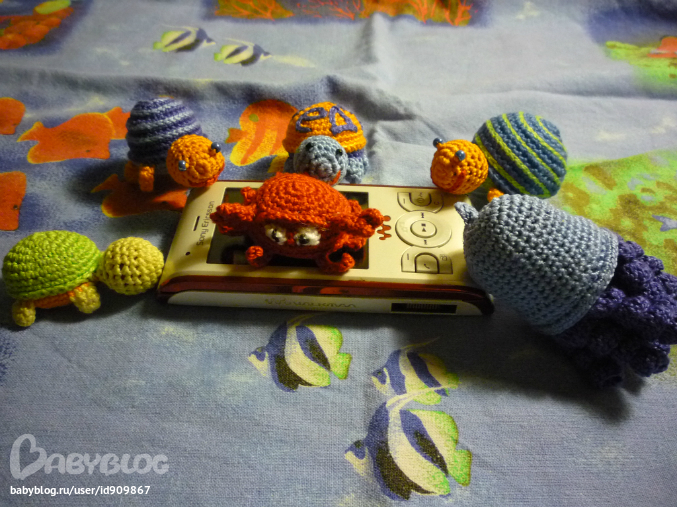 Первая моя черепашка по имени Женя ( так зовут девушку, которая рассказала мне,как она вяжет черепашек), она до сих пор безликая 6) но,может, в этом и есть ее прелесть ;) Голова - можжевеловая бусина, в теле - холлофайбер. Осьминожка-гремелка тоже так и осталась без мордашки