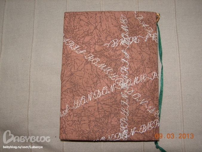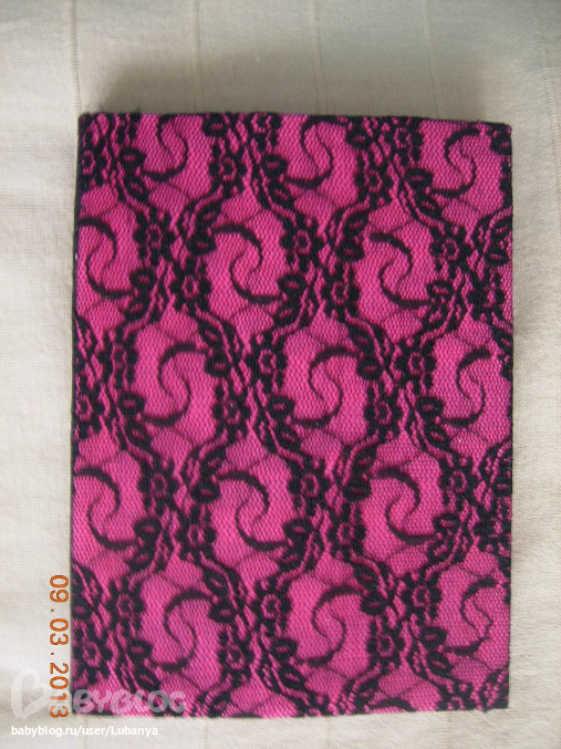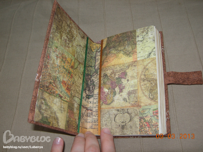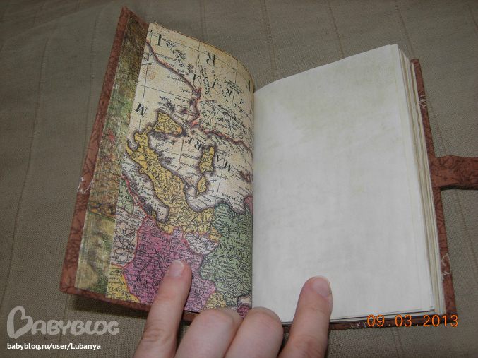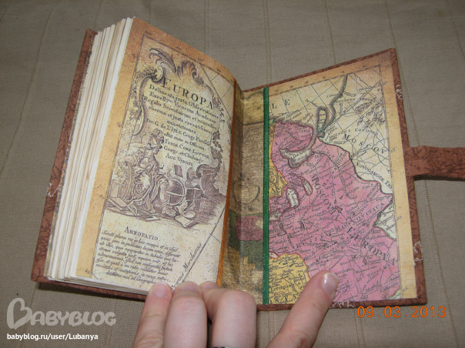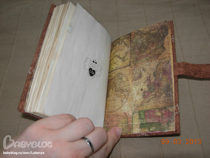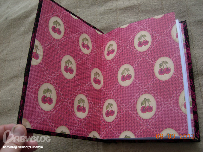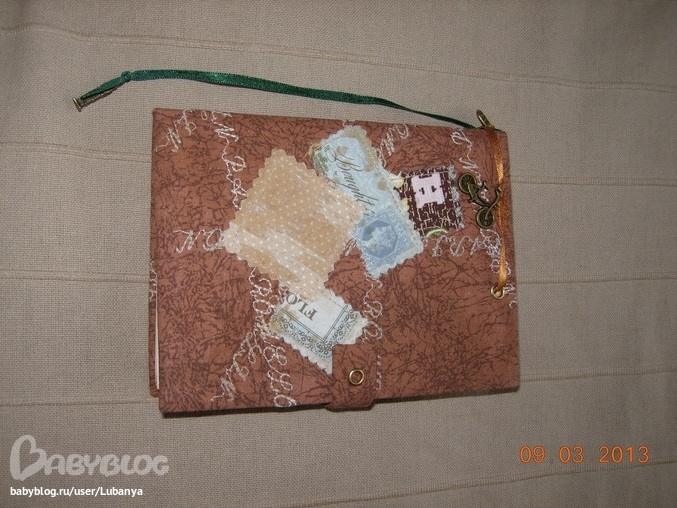 Формат А5, 80 листов. Часть страничек с картинками. Обложка - картон, трикотаж, кружево, скрап бумага, пуговицы. вощеный шнур. Форзацы скрап бумага.