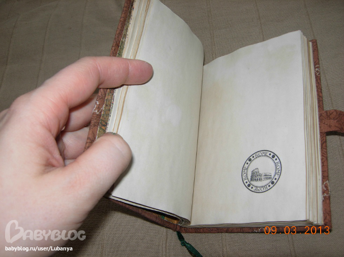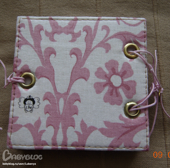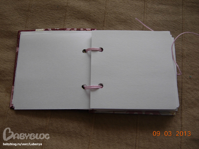 Размер 9,5*9,5 см, около 100 листов. Обложка - картон, хлопок, металлические люверсы, вощеный шнур