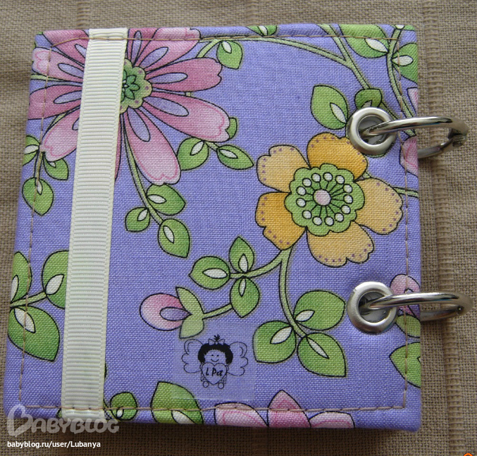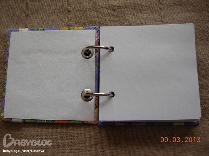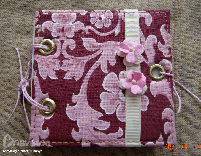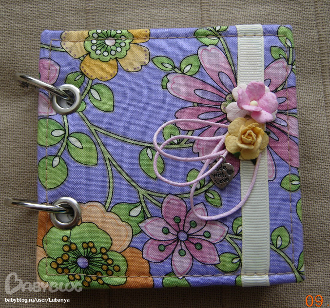 Размер 9,5*9,5 см, около 100 листов. Обложка - картон, хлопок, металлические люверсы, репсовая лента, цветочки, разъемные кольца (по мере использования можно заменить листочки).