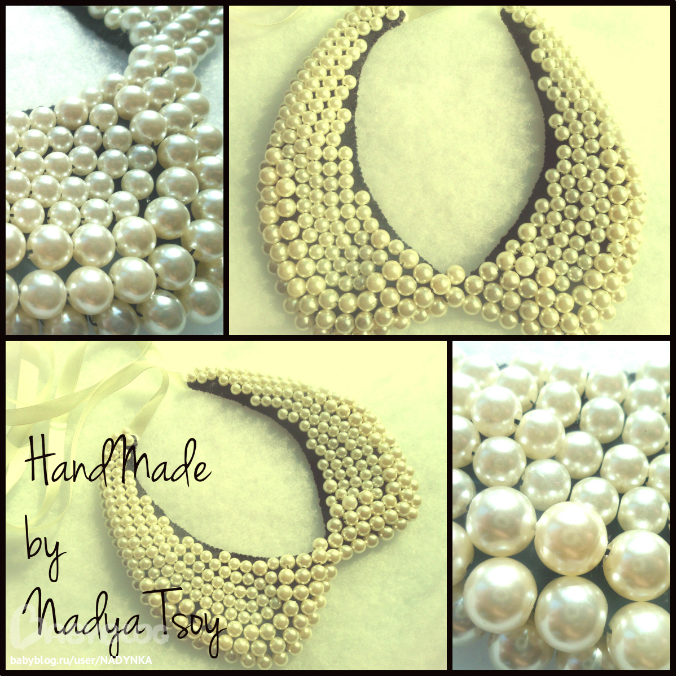 И нкаонец венец моего творчества)) не знаю почему, но этот воротник мне ооочень нравится) искусственный жемчуг, кожа и атласная лента