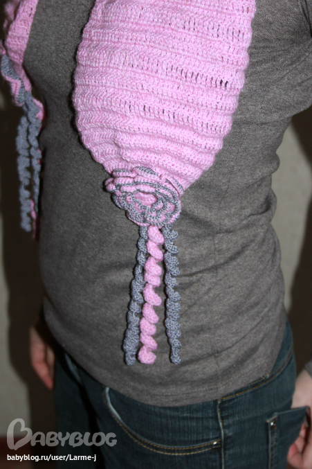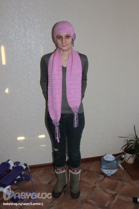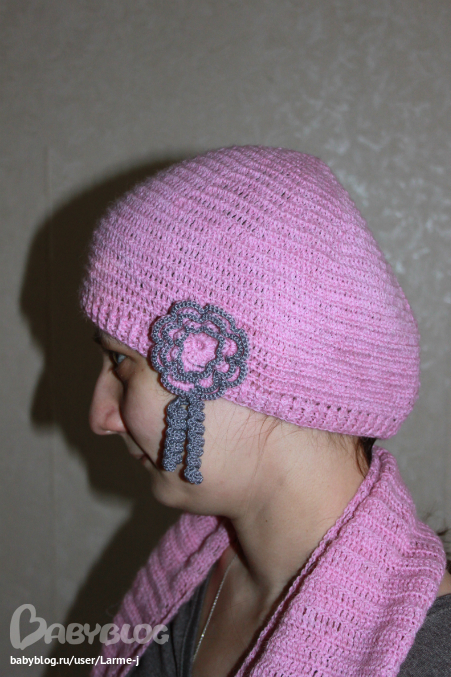 Розовая - та же шарсть, что и на берете, но в одну ниточку, поэтому шапочка легкая и воздушная, к ней же шарфик. Жду весну, чтобы носить.