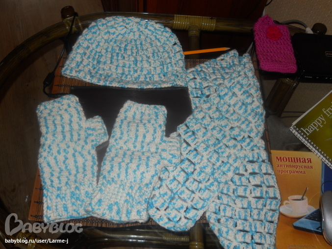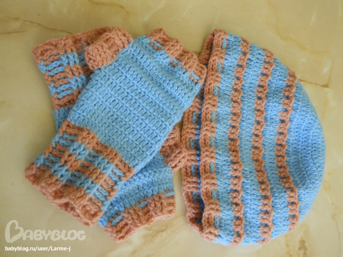 Голубая с коричневый - пряжа Бэьи акрил, очень мягкая и приятная пряжа, к шапочке связались митенки.