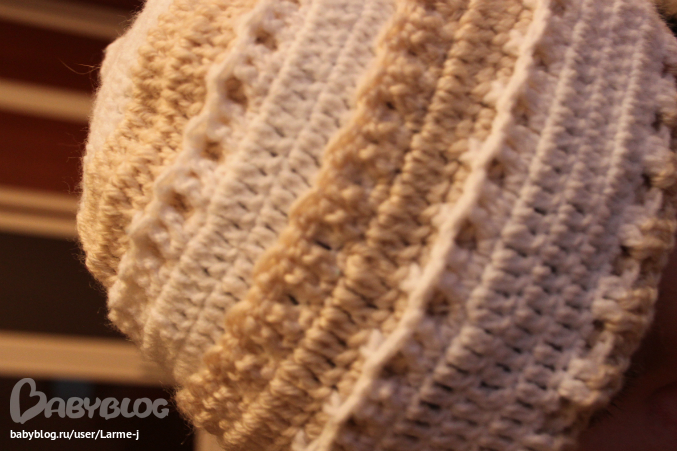 Белая с бежевым - шапочка на сейчас, пряжа шерсть (бежевая) и акрил (белая). Вязала под куртку.
