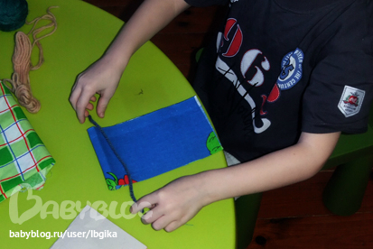 Нам понадобятся кусочки материала, пряжа, ленточки, ножницы, клей, картон.