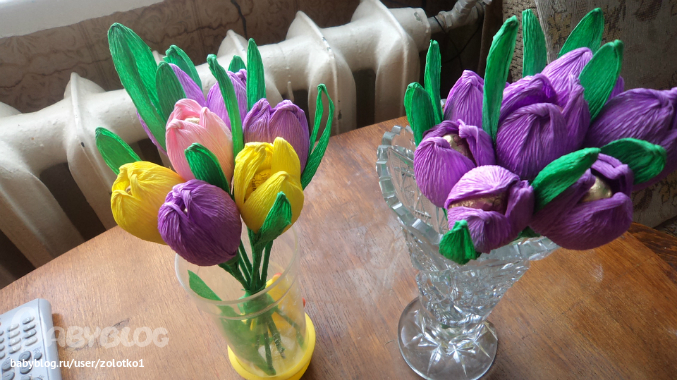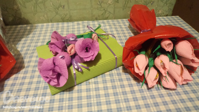 Наталья, цветочки хорошие. Дневное фото без всего - солнечные, аккуратные крокусы. И розочки с маками -нежные и трогательные. Но красная пленка с золотой сеткой сюдя явно не подходят и весеннее натроение букетов не поддерживают.((( Вот на коробочке с подарком и упаковка и оформление смотрится уже гармонично. ИМХО, не обижайтесь.