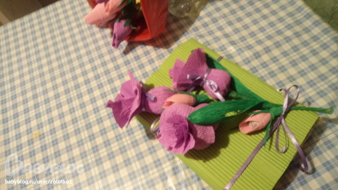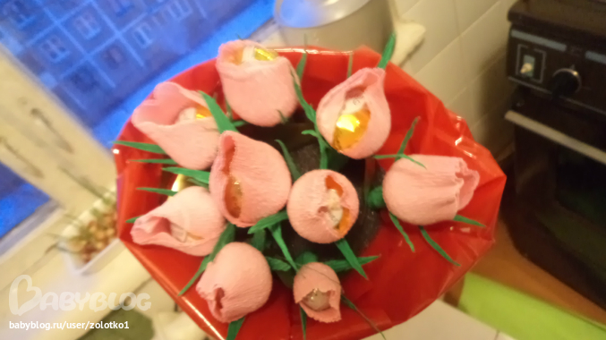 В этом году у нас в садике какая-то неорганизованная группа-денег не собираем никого не поздравляем-а у нас в общем -то неплохие няни-заведущие и пр. пр.Решила поздравлять от себя,но....это как минимум 5-6 подарков,а бюджет скажем прямо не резиновый...И как рукодельная мама я решила сделать букеты из конфет+воспитательнице подарок этим же букетом и украсить....Доделывала ночью,так что фото мысленно фотошопим...