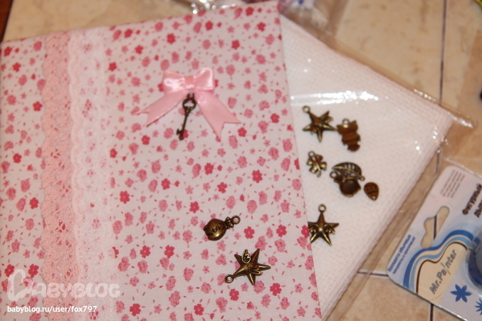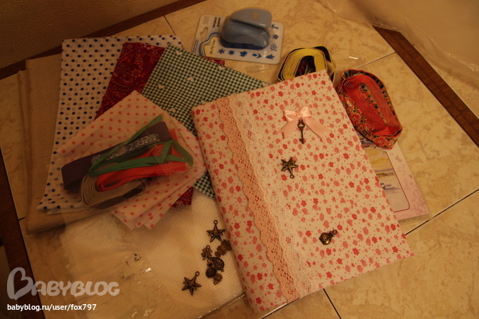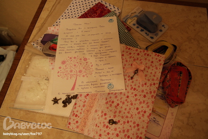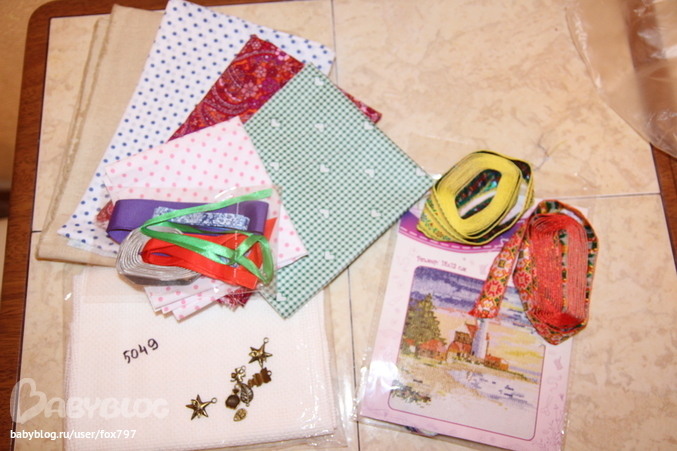 Еще Дайаана мне подарила ткань, ленты для моих будущих (надеюсь) Тильд, канву и набор для вышивания с маяком, дырокол с зайкой, шармики (много, красивые, просто нет слов для описания) и еще кучу полезностей для скрапа. Смотрим