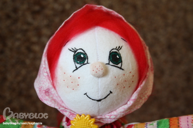Сшита из фланели, одежда и косынка из хлопка, волосы - шерсть для валяния, декорирована кинтажным кружевом и пуговичкой подсолнухом. Стоит самостоятельно