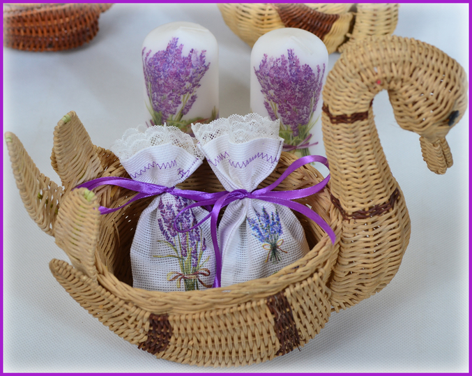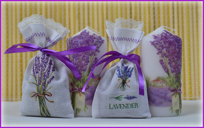 Ароматизированные саше с лавандой, декупаж на ткани, декупаж на свечах.